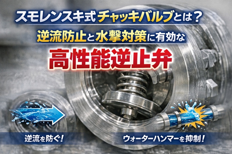 スモレンスキ・チャッキバルブとは、スプリングを内蔵した逆止弁の一種です。流体の流れが止まるタイミングに合わせて弁体が素早く閉じることで、逆流や水撃(ウォーターハンマー)のリスク低減に寄与するとされています。