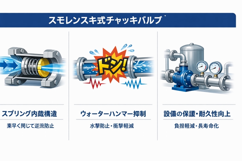 スモレンスキ式は、逆流が発生する前に弁体が閉じる動作を狙うことで、ウォーターハンマーを防止・軽減する考え方に基づく製品として知られています。
